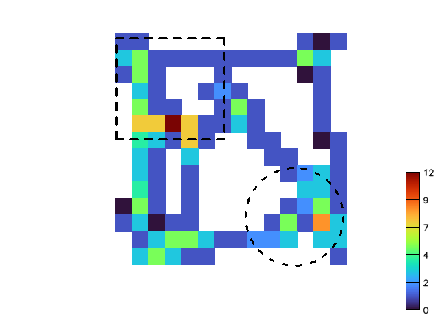 - 何を示しているか?: 各エリアをターゲットの軌跡が「何回通過したか」を示します。通過回数が多いほど赤くなります。
